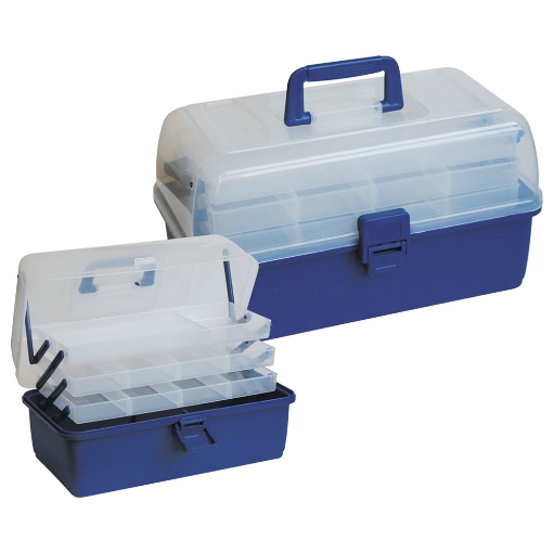 Třípatrový kufřík s transparentním víkem vyrobený z polypropylenu. Dvě patra mají 3 volně stavitelné přepážky s rozměry 21x4.5cm a vrchní patro má dvě pevné podélné přepážky a jednu příčnou přepážku s prostorem 10 x 10 cm.