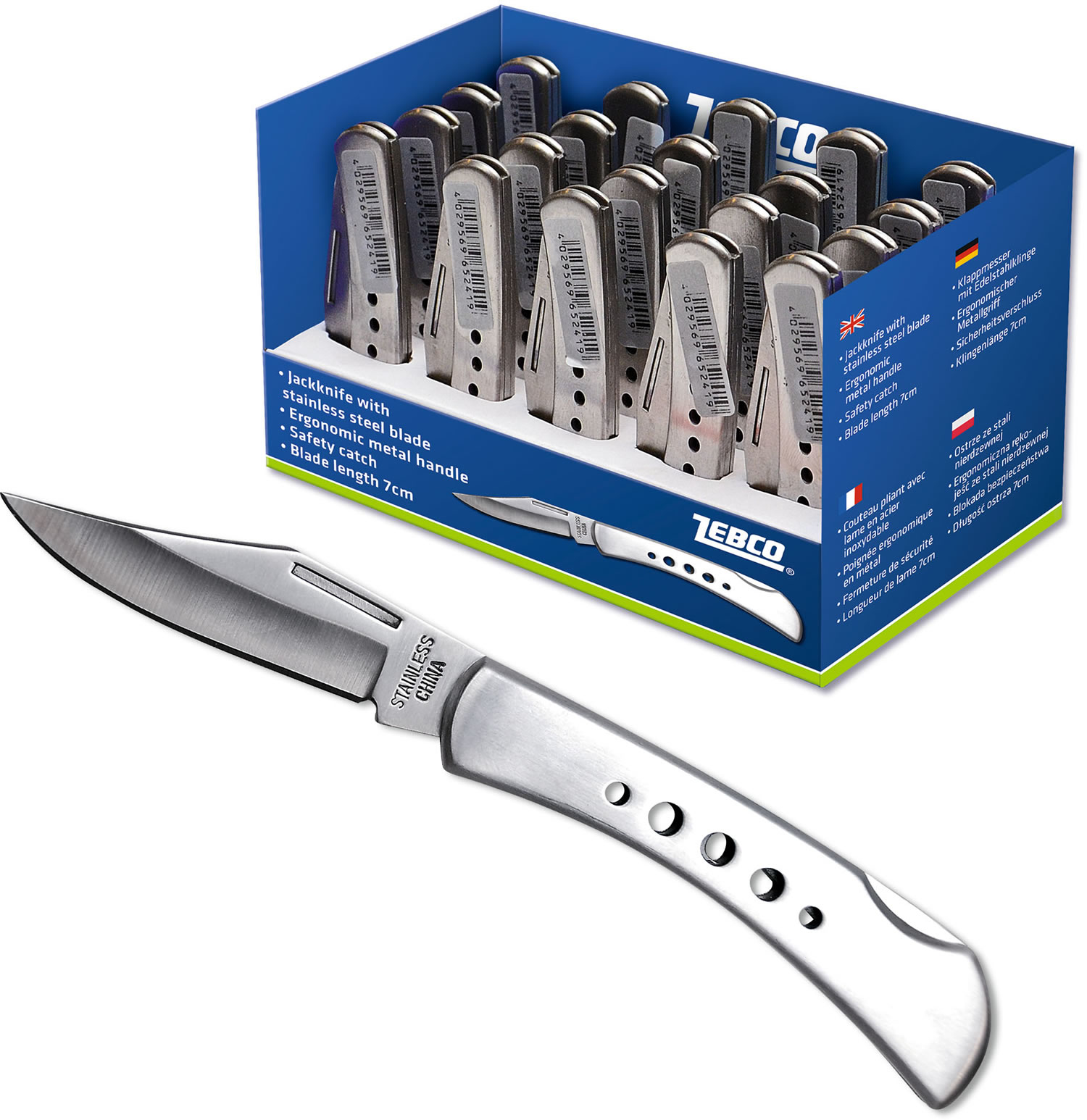 Couteau de poche pliant avec manche en métal et lame de 7 cm de long. Un cadeau approprié que chaque pêcheur, quel que soit son équipement, appréciera.