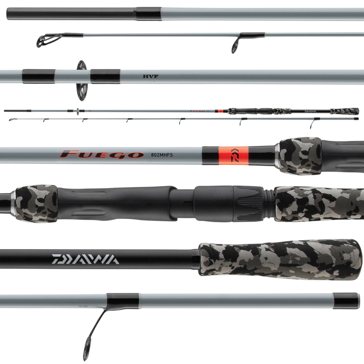 Wraz z serią Fuego Camo DAIWA prezentuje szeroką ofertę nowoczesnych spinningów o sztywnych blankach, które świetnie spisują się w trakcie połowu sztucznymi przynętami niemal w każdych możliwych warunkach i łowiskach. Duża sztywność wędek Fuego Camo predysponuje je w szczególności do łowienia imitacjami z miękkiego plastiku. Zastosowanie ekskluzywnego kompozytu węglowego DAIWA HVF do konstrukcji blanku umożliwiło zbudowanie bardzo szybkich i lekkich spinningów, fantastycznie leżących w dłoni. Utrzymane w nowoczesnej, szarej stylizacji wędki wyposażone są w oryginalny uchwyt kołowrotka Seaguide i wysokiej jakości rękojeści EVA Camouflage. Wysokiej klasy uchwyt kołowrotka Seaguide Alien posiada boczne wycięcia zapewniające bezpośredni kontakt z blankiem, a więc i znacznie lepsze wyczucie przynęty. Ergonomiczny kształt uchwytu sprawia, że bardzo wygodnie leży w dłoni, co jest nie bez znaczenia podczas długich wypraw. Wyposażone w lekkie przelotki Titanium-Oxyd.
