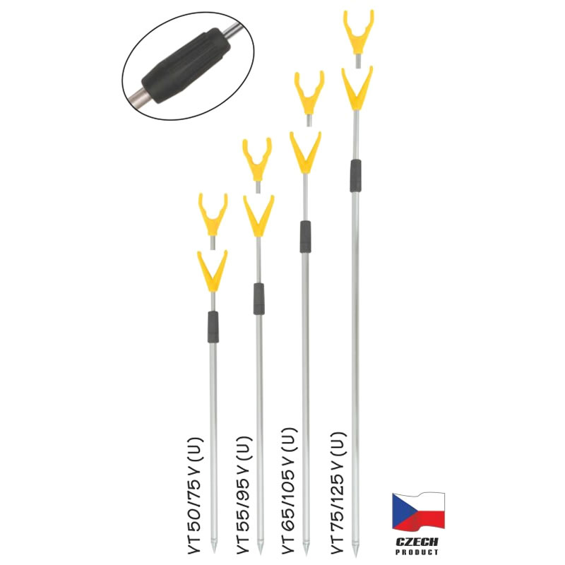 Teleskopické vidličky z eloxovaného hliníku průměru 12/8 mm s tvarovým zakončením V nebo U. Vidlička je zakončena plastovým dílem ve tvaru "V" (přední) nebo "U" (zadní) žluté barvy. Plast je nárazuvzdorný a odolávající teplotním změnám.