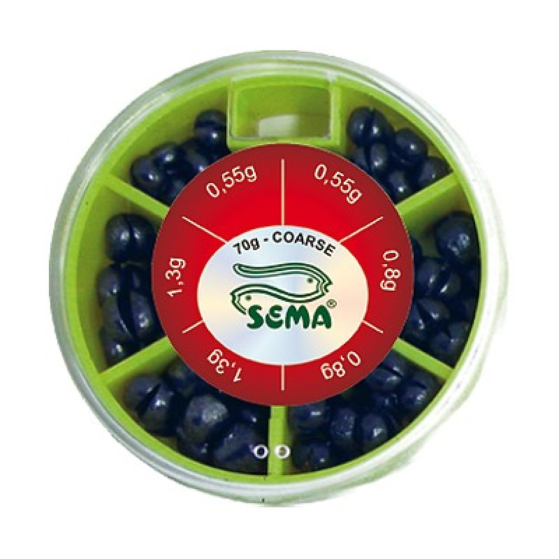 Sada dělených hrubých olověných broků v praktické krabičce na plavanou.