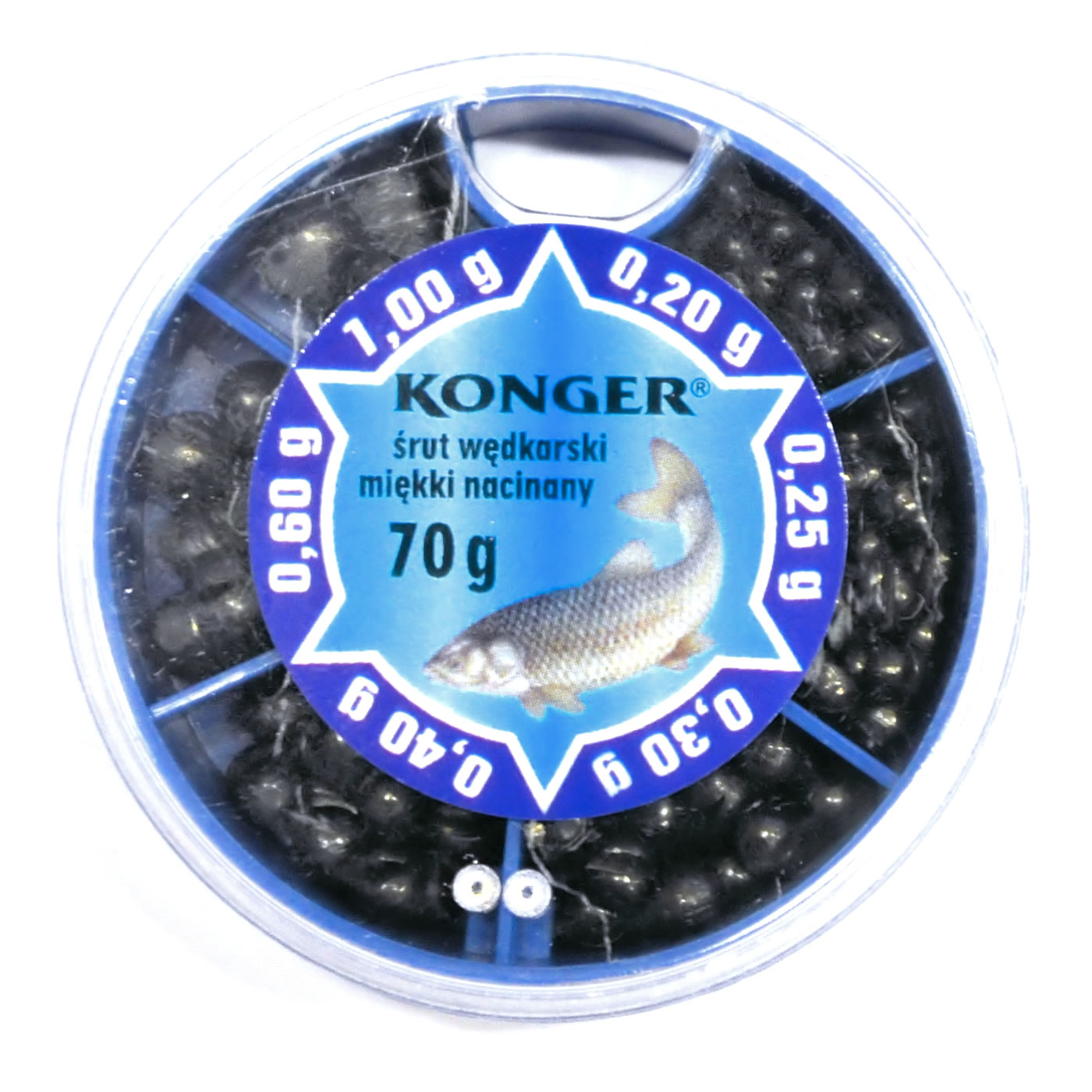 Sada dělených středně velkých olověných broků v praktické krabičce na plavanou.