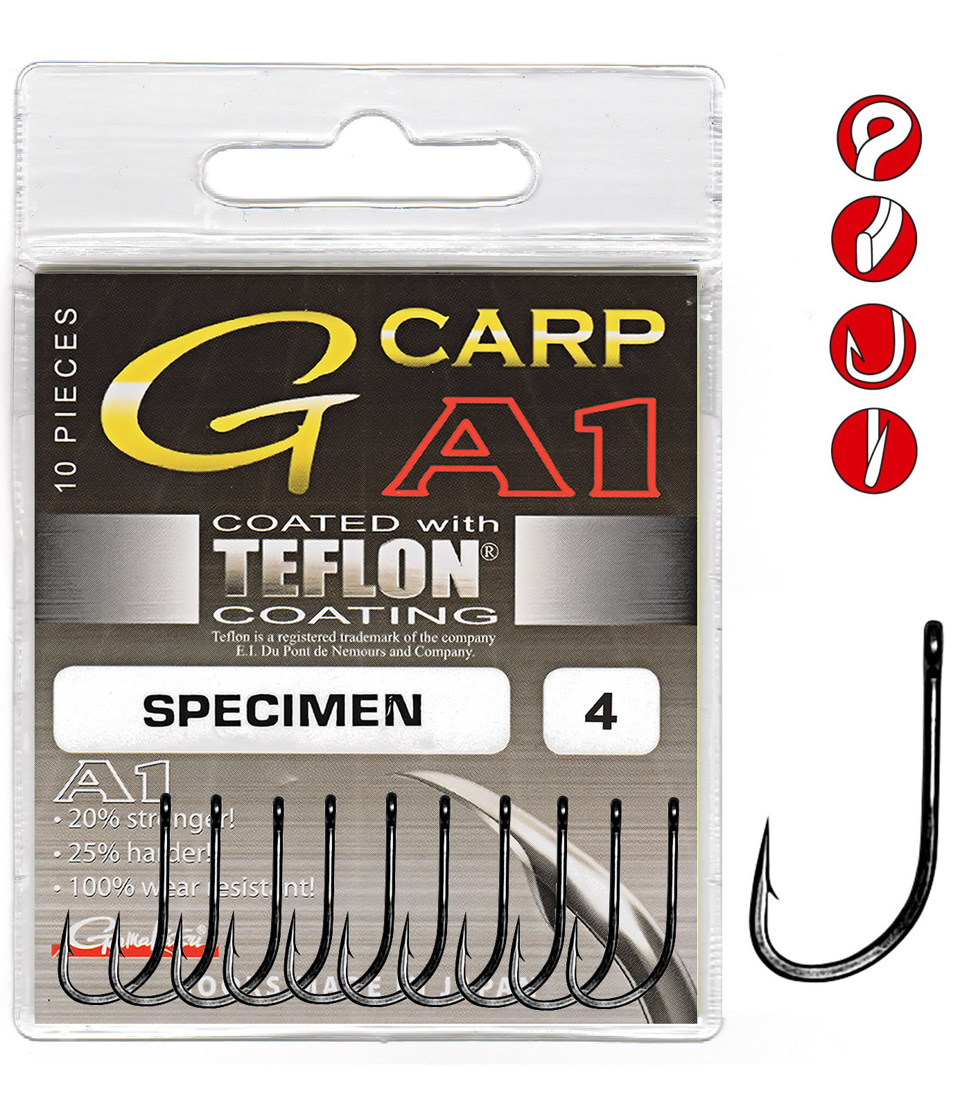 A1 je název unikátního materiálu, speciálně navrženého pro výrobu háčků. Tento materiál obsahuje Tungsten a Vanadium, což je pro výrobu háčků naprosto unikátní kombinace. Háčky jsou díky ní o 20% pevnější, rybář si může pro konkrétní cíle vybírat menší háčky. Menší háčky umožňují lepší prezentaci návnady a kromě toho může být návnada také menší. Menší a lehčí háček je tenčí, než běžné háčky, a proto snáze pronikne a nepoškozuje návnadu. A1 háčky jsou velmi trvanlivé i tehdy, když se zahákne velká ryba. A1 háčky jsou o 25% tužší, než obvyklé háčky. Díky tomu si déle udrží ostrý hrot. Poškození pískem či kameny jsou nyní minulostí. Velmi důležitým faktem je i to, že hroty háčků pronikají tužšími materiály snáze díky tvrdosti hrotu. Nové A1 háčky nabízí rybářům o 100% více důvěry, protože mají dvojnásobnou životnost. Jsou také 100% odolnější vůči oděru, takže rybář už se nemusí obávat, že háček se chycením ryby ztupí.