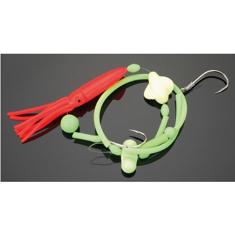 Montáž se dvěma háčky a umělým kalamárem, osazená rotační rolničkou a extra ostrými háčky, ideální pro lov na hloubkách 50 - 300 m. Použijte celé živé nebo mrtvé ryby. Vhodné pro mníky, tresky a halibuty.