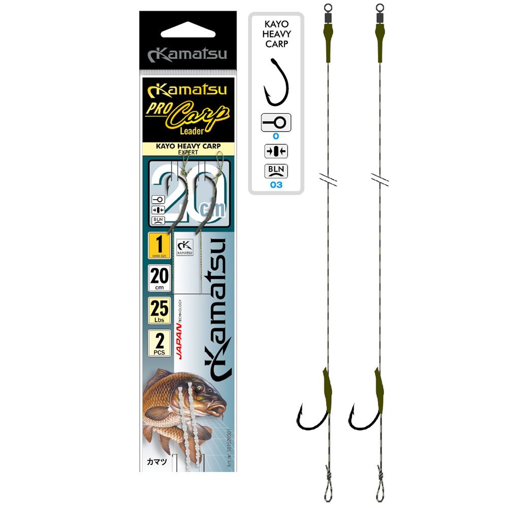 Speciální návazce určené zejména pro lov kaprů metodou "na vlas". Byly testovány na mnoha ulovených kaprech v celé Evropě a fungovaly dobře za všech podmínek. Návazce Kamatsu Pro Carp jsou vynikající volbou pro všechny rybáře lovící velké kapry díky použití nejkvalitnějších komponent. Šňůra a uzel návazce zaručují, že návnada vypadá přirozeně a není podezřelá ani pro ty nejopatrnější ryby. K montáži byly použity pouze vybrané háčky a obratlíky Kamatsu, aby se předešlo nepříjemným překvapením při rybolovu. Háčky jsou vázány nejúčinnější metodou - takzvaným „bezuzlovým uzlem“. Obratlíky jsou navázány zvláštním uzlem který rozloží zatížení na celý uzel, spíše než na bod dotyku s obratlíkem. Návazce jsou postaveny na klesajících šňůrkách barevně uzpůsobených pro zaručení maskování u většiny typů dna. Ideální pro perfekcionistické rybáře, kteří mají rádi své hobby.