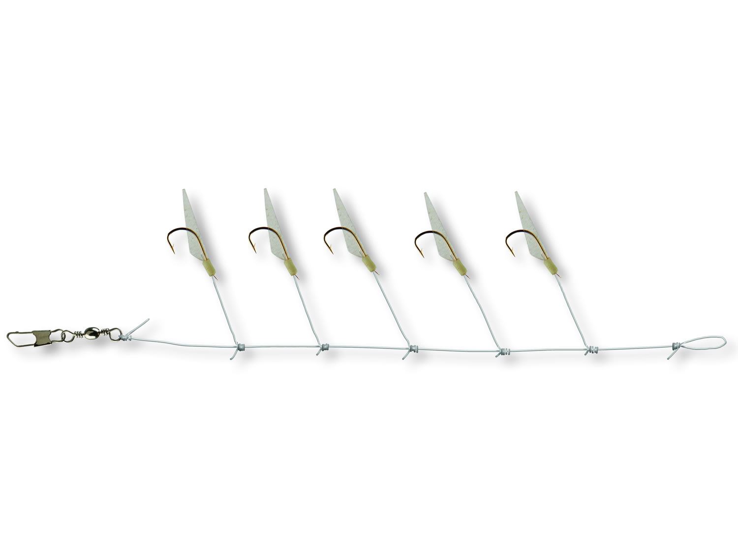 Návazec „Fine Glow“ s pěti háčky, svítícím korálkem a pravou japonskou rybí kůží. Perfektní ve studené vodě, když jsou sledi méně aktivní.