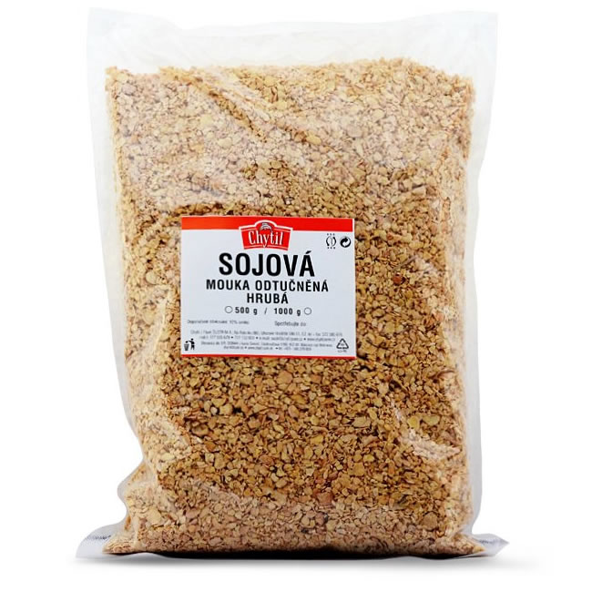 Sojová mouka je vyrobena z pražených sojových bobů. Tato odtučněná sojová mouka je dokonce více koncetrovaný zdroj proteinů než tomu je u plnotučné sojové mouky. Neobsahuje lepek ani škrob, má málo sacharidů (12%). Odtučněnou sójovou mouku najdeme v různých sladkostech, cukrovinkách a čokoládových polevách či náplních, dětské výživě, v corn flakes, dále šlehačkách, zmrzlinách a tvoří nedílnou součást v mnoha masných výrobcích a uzeninách. Má vysoký obsah proteinů, zvyšuje nutriční hodnotu směsi, dobře stravitelná a lehce pojivá.