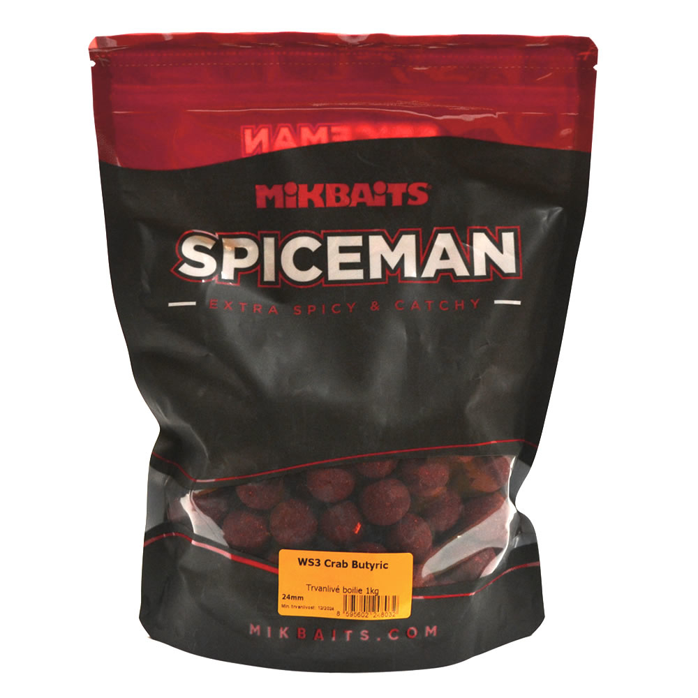 Spiceman WS3 Crab&Butyric je vysoce rozpustné, velmi atraktivní a rychle účinkující boilie. Má silnou stopu esence Krab a ještě větší závan Butyricu, ale jeho chuť je díky použitým přísadám ostře kořeněná. Podobně jako WS1 a WS2 je skvělý 365 dní v roce, ovšem z těchto tří je nejlepší v teplém letním období. Doba rozpadu v teplé vodě může být kolem 3-4 hodin, v chladné pak vydrží i kolem 12h. Takovou dobu se však s WS speciálem čeká málokdy. Záběry na něj bývají velmi časté, a to i při střídmém vnadění. Je skvělý nejen v chladných obdobích, ale celoročně při krátkých vycházkách nebo na závodech. I když je to především záběrové boilie na ryby všech velikostí, často se na něj uloví i trofejní kapři a amuři.