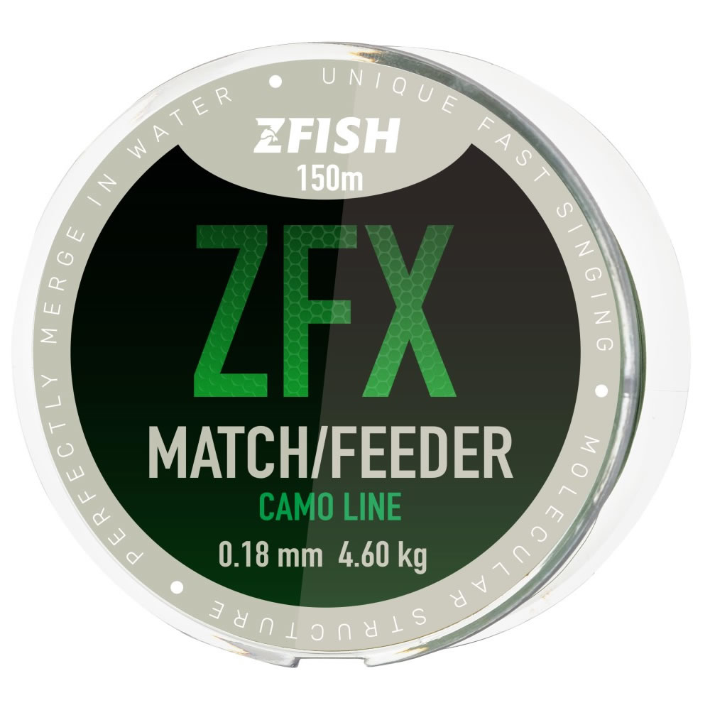 ZFISH vlasec ZFX Match/Feeder CamoLine to je unikátní, rychle potápivý vlasec na feeder a plavanou s jedinečnou CAMO vlastností. Tento specilání vlasec je vyráběn jedinečným procesem, při kterém se do vlasce implementuje molekularní struktura mikročástic a to má za výsledek zcela unikátní vzhled a vizuální vlastnosti tohoto materiálu. Tento vlasec dokonale a přirozeně splyne s podvodním prostředím a planktonem a pro ryby se stává prakticky neviditelným a vůbec je neruší. Dalšími důležitými vlastnostmi jsou jeho nízký průtah, již zmiňované rychlé potápění, nosnost a odolnost proti oděru.