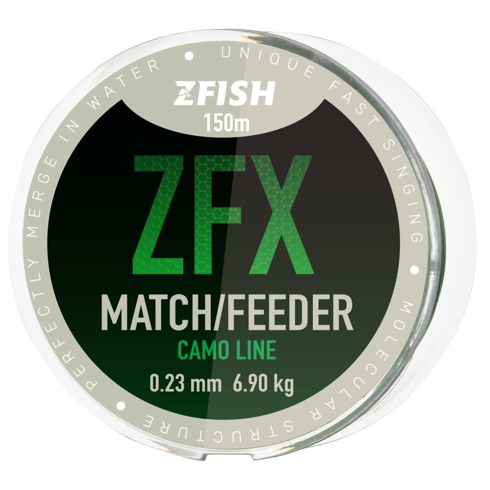 ZFISH vlasec ZFX Match/Feeder CamoLine to je unikátní, rychle potápivý vlasec na feeder a plavanou s jedinečnou CAMO vlastností. Tento specilání vlasec je vyráběn jedinečným procesem, při kterém se do vlasce implementuje molekularní struktura mikročástic a to má za výsledek zcela unikátní vzhled a vizuální vlastnosti tohoto materiálu. Tento vlasec dokonale a přirozeně splyne s podvodním prostředím a planktonem a pro ryby se stává prakticky neviditelným a vůbec je neruší. Dalšími důležitými vlastnostmi jsou jeho nízký průtah, již zmiňované rychlé potápění, nosnost a odolnost proti oděru.
