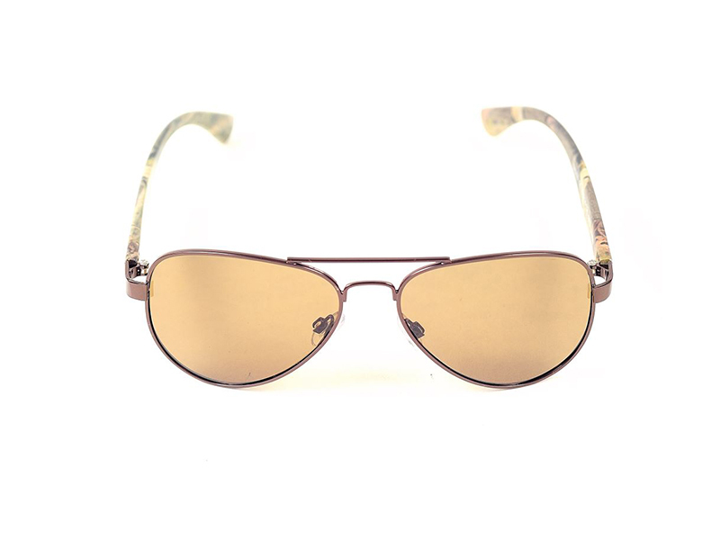 Sportliche Brille mit braunen Gläsern. Braun erhöht Kontrast und Tiefenwahrnehmung, ideal zum Fische spotten. Camo-Rahmen und gehärtetes Glas.