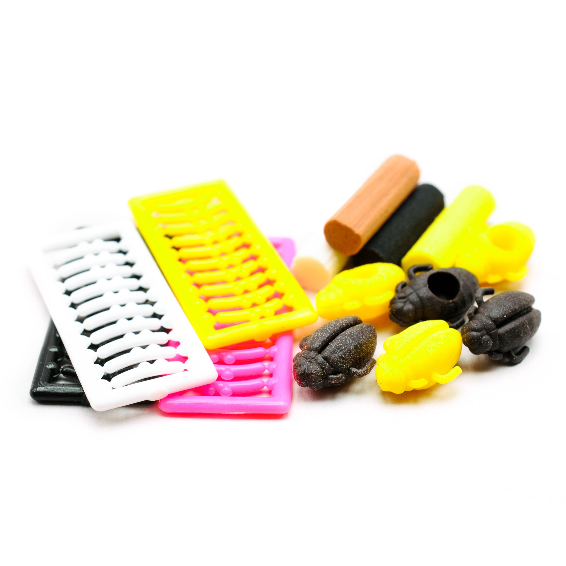 Set enthält 6 Käferkörper (3 gelb, 3 schwarz), 4 Schaumstoffeinsätze für Auftrieb und 4 Stopper-Sets. Einfach zu montieren. Schwarze Silhouette top gegen Licht, Gelb als Reiz.