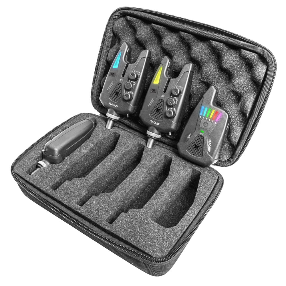 Das FLACARP X7 3+1 Set ist die perfekte Ausstattung für das Fischen mit drei Ruten. Die X7 Bissanzeiger reagieren bereits auf 1,5 mm Schnurbewegung, was höchste Sensibilität garantiert. Der RX7 Empfänger übernimmt automatisch die Ton- und Farbeinstellungen der Bissanzeiger. Das wetterfeste System bietet eine überragende Reichweite von 1500 m und wird im stabilen Koffer geliefert.