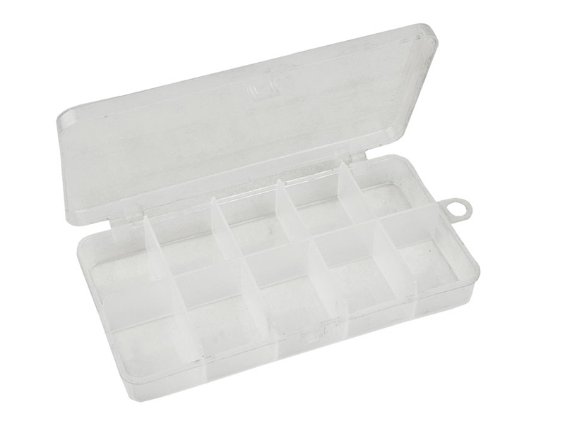Universeller Organizer. Diese mittelgroße Box bietet Platz für Kunstköder oder Zubehör. Der Innenraum ist in 10 Sektionen unterteilt, die sich durch herausnehmbare Trennwände anpassen lassen.