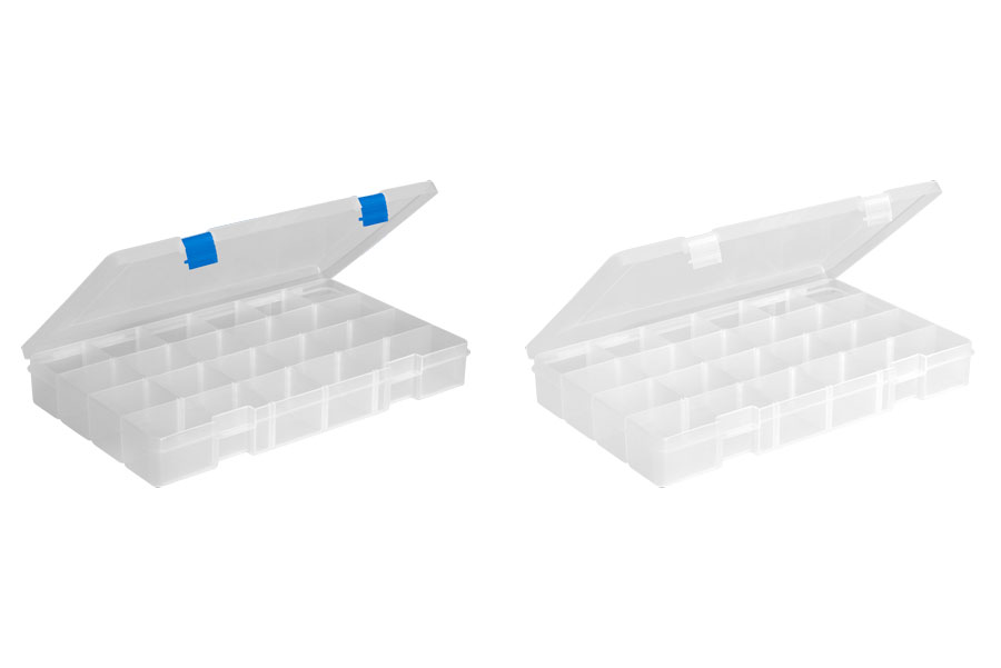 Universelle Box mit kleinerer Grundfläche, aber 8 cm Höhe. Die Tiefe erlaubt das Verstauen sperriger Gegenstände (Futterkörbe, Spulen).