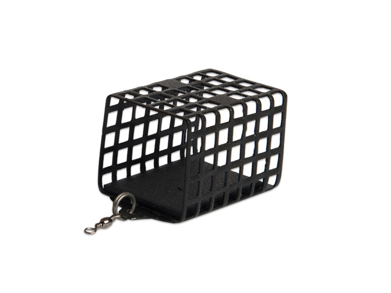 Extra leichter Drahtkorb mit eckigem Profil. Die quadratische Form sorgt für besseren Halt am Grund als runde Körbe und verhindert das Wegrollen an Kanten oder in leichter Strömung.