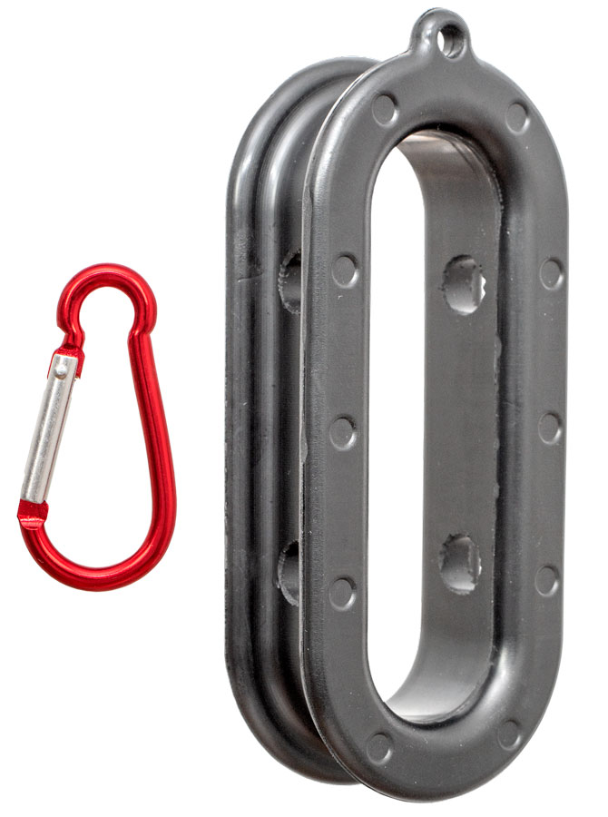 Anwendung: Schnur um den gummierten Zylinder wickeln, Hand durchstecken und ziehen. Mit Karabiner zur Befestigung an Weste oder Tasche.