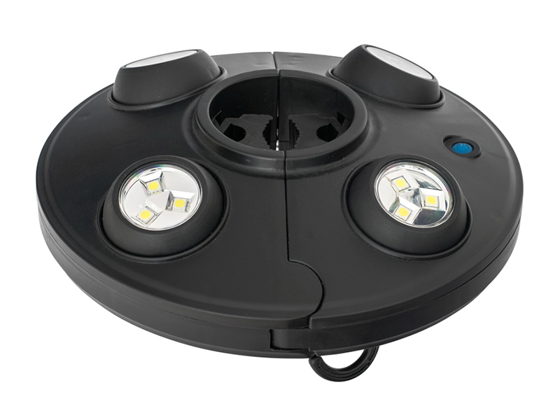 Multifunktionslicht für Nachtangler. Verfügt über vier unabhängig verstellbare Leuchten (je 3 LEDs). Dank Klemmbacken einfach an Schirmstangen oder Zeltgestänge zu befestigen. Auch mit Haken zum Aufhängen.