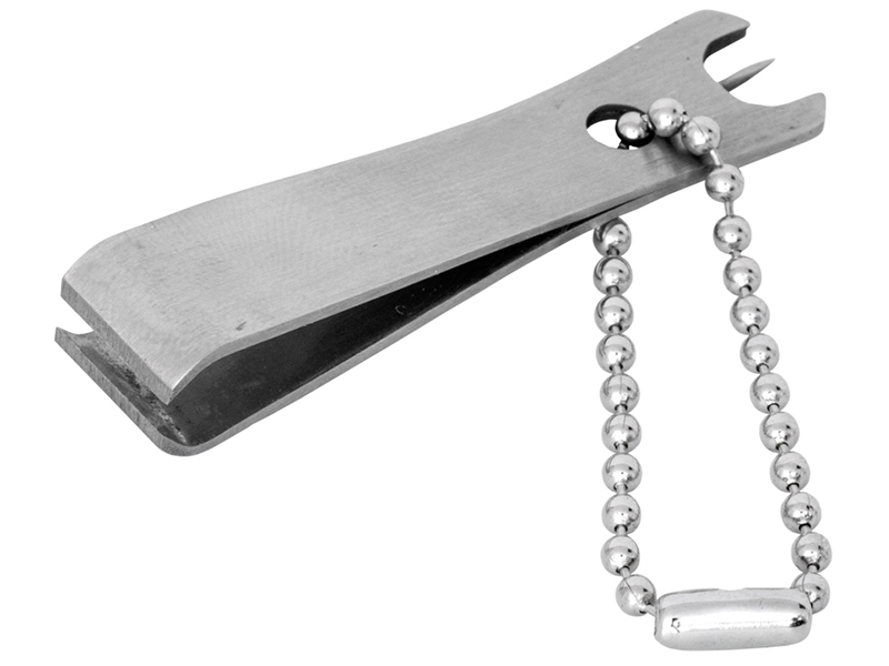 Compact stainless steel tool for quick cutting of monofilament and braid. Small size fits any pocket. Includes a ball chain for attachment to a vest, bag, or buttonhole, ensuring they are always at hand.