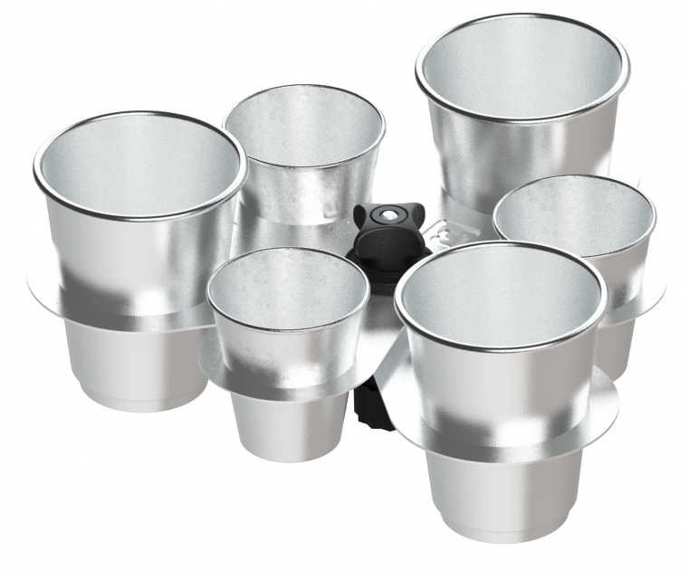 Set de 6 gobelets inox Fasten avec support ajustable pro embase universelle. Tailles 60ml et 150ml.
