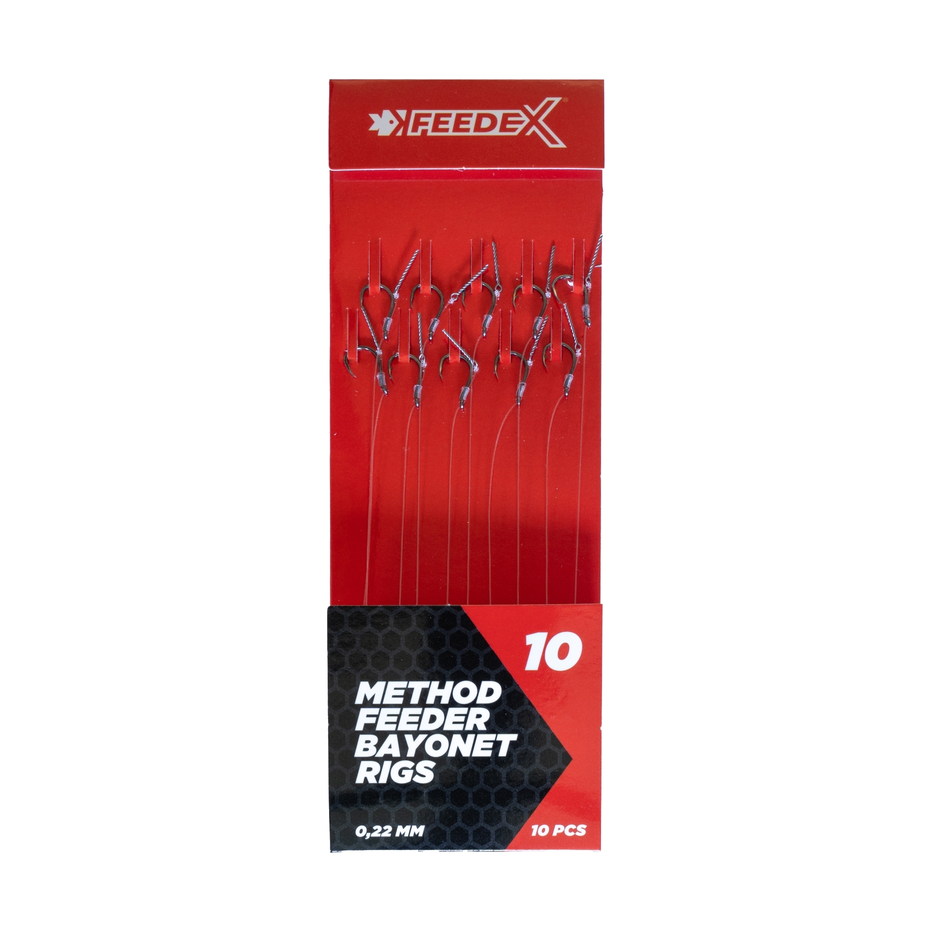 Gotowe przypony Feeder Expert Method Feeder z bajonetem (wkrętką) stworzono do błyskawicznej prezentacji waftersów, pop-upów i kukurydzy. Uzbrojone w haczyk Spec-X nr 10 o szerokim łuku. Przypon z 10 cm fluorocarbonu jest niewidoczny i sztywny, co zapobiega plątaniu zestawu. Bajonet pozwala na wbicie przynęty bez użycia wiertła czy igły.