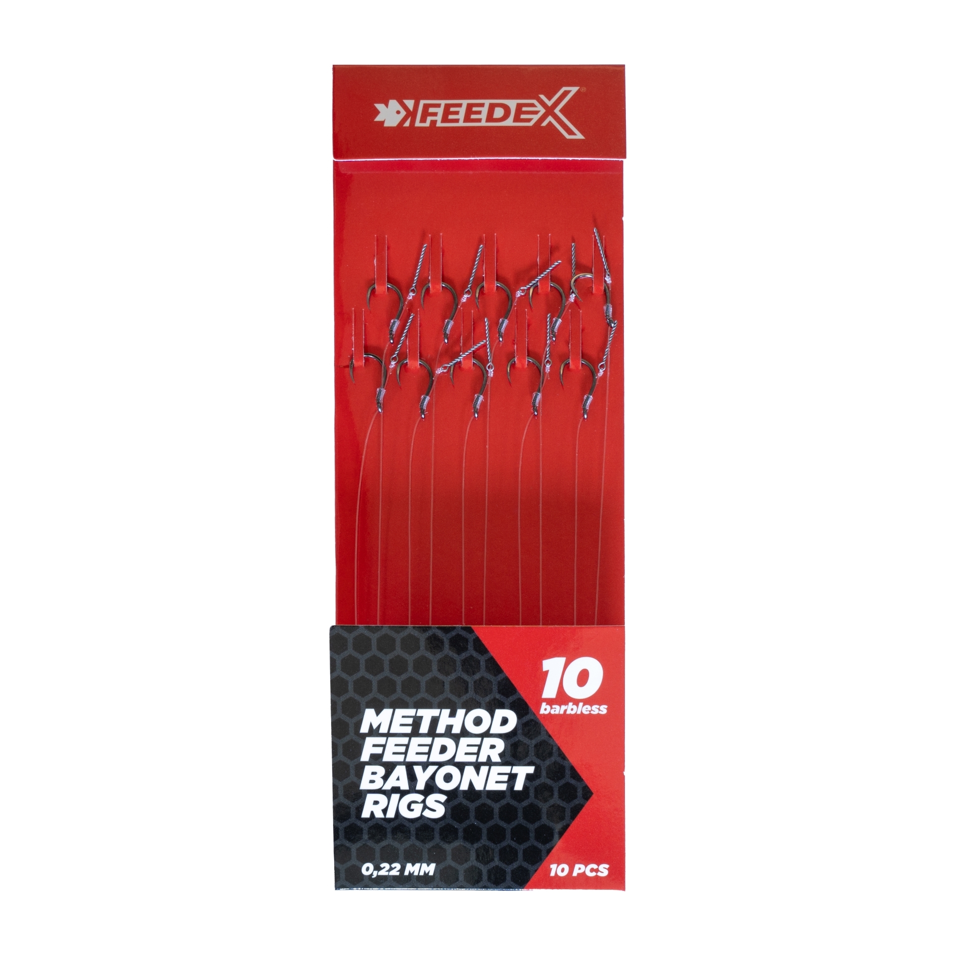Gotowe przypony Feeder Expert Method Feeder z bajonetem (wkrętką) w wersji bezzadziorowej stworzono na łowiska komercyjne. Uzbrojone w haczyk Spec-X, który dzięki szerokiemu łukowi pewnie trzyma rybę mimo braku zadzioru. Przypon z 10 cm fluorocarbonu jest niewidoczny i sztywny. Bajonet pozwala na błyskawiczne założenie waftersów bez użycia wiertła.