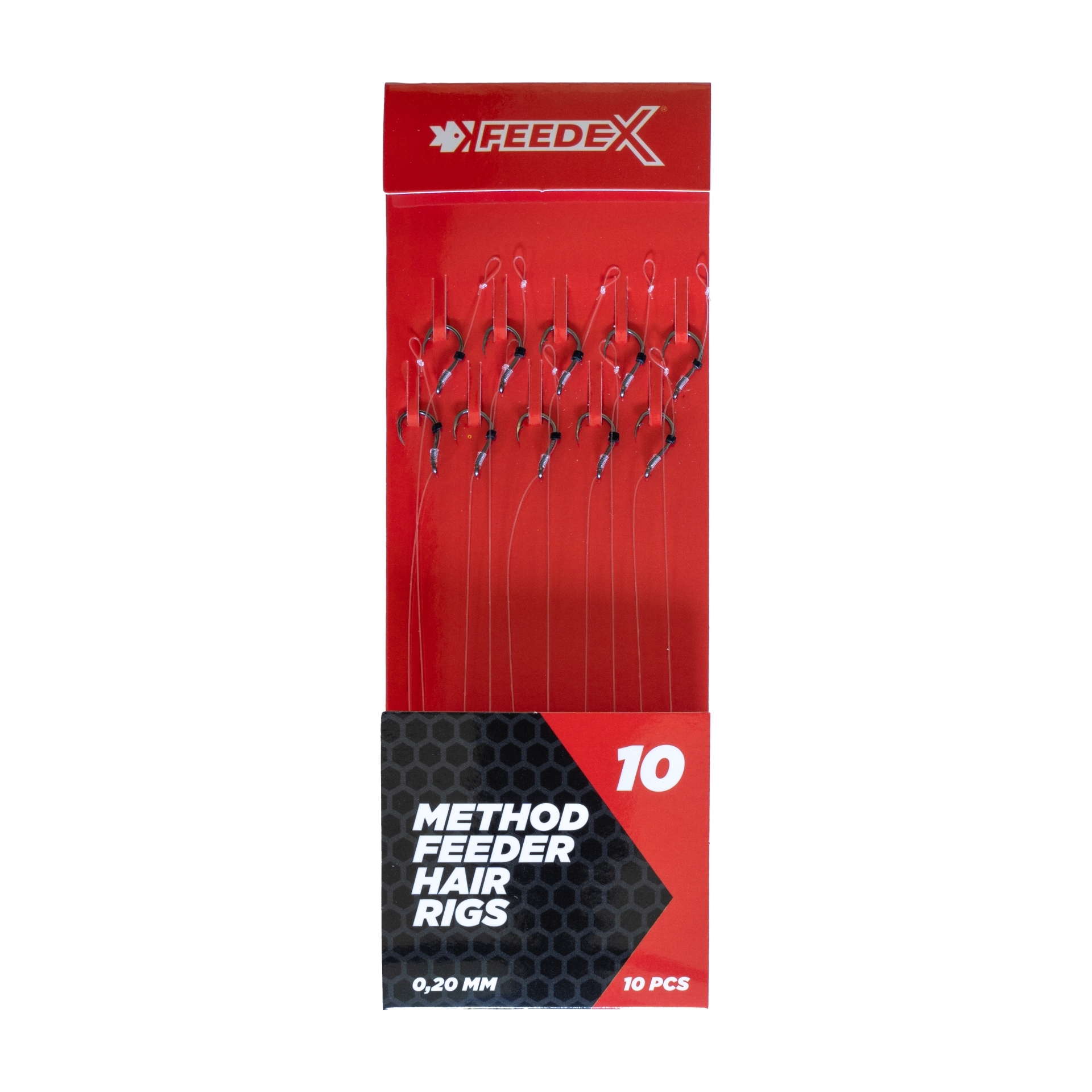 Gotowe przypony Feeder Expert Method Feeder z klasycznym włosem zakończonym pętelką to uniwersalny wybór do łowienia na pellet, kulki lub ziarna. Uzbrojone w profesjonalny haczyk Spec-X nr 10 o szerokim łuku. Przypon z 10 cm fluorocarbonu jest niewidoczny pod wodą i dzięki sztywności zapobiega plątaniu se zestawu podczas rzutu.